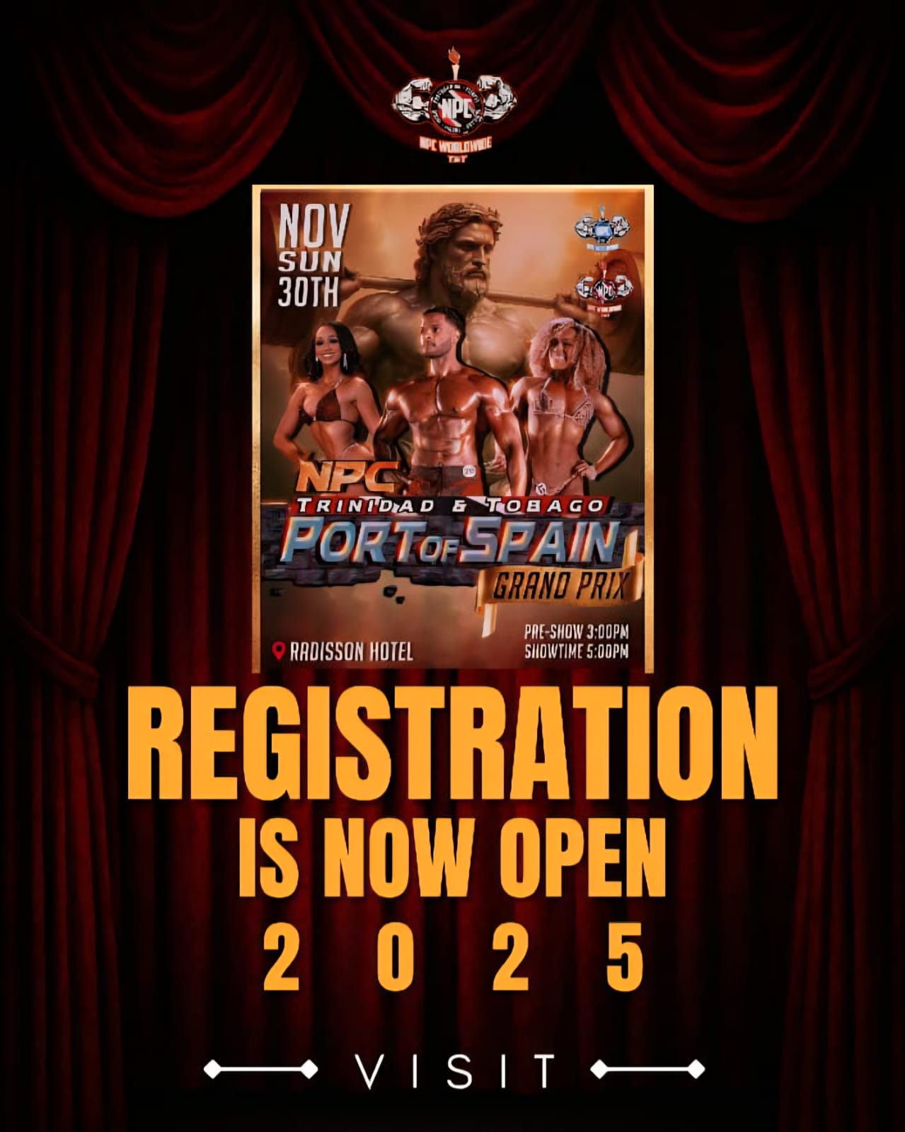 Click here to register: https://www.npcsudamerica.com/preinscripciones-tt/npc-port-of-spain-grand-prix-trinidad-tobago